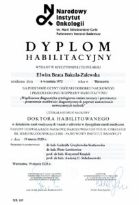 W 2011 roku zdobyła tytuł doktora nauk medycznych, a w 2025 roku uzyskała stopień doktora habilitowanego nauk medycznych na podstawie oceny ogólnej dorobku naukowego i przedstawionej rozprawy habilitacyjnej pt.: „Współczesna diagnostyka cytologiczna zmian tarczycy i przytarczyc – poszerzenie możliwości diagnostycznych poprzez zastosowanie nowoczesnych technik”.